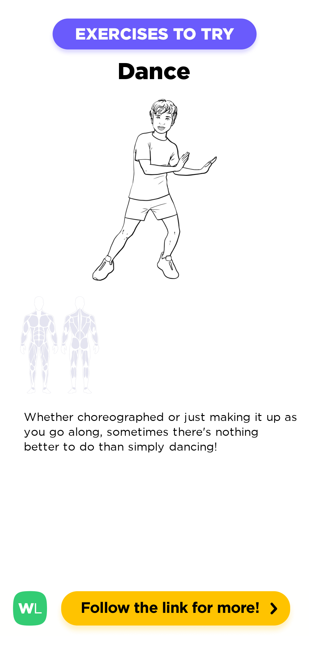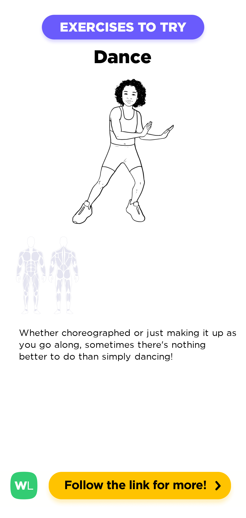 Dance / dancing is a at-home work out exercise that targets . Refer to the illustration diagram and instructions above for how to perform this exercise correctly. are related exercise that target the same muscle groups as dance / dancing. Visit our free illustrated exercise directory for more exercises to try in your workouts.