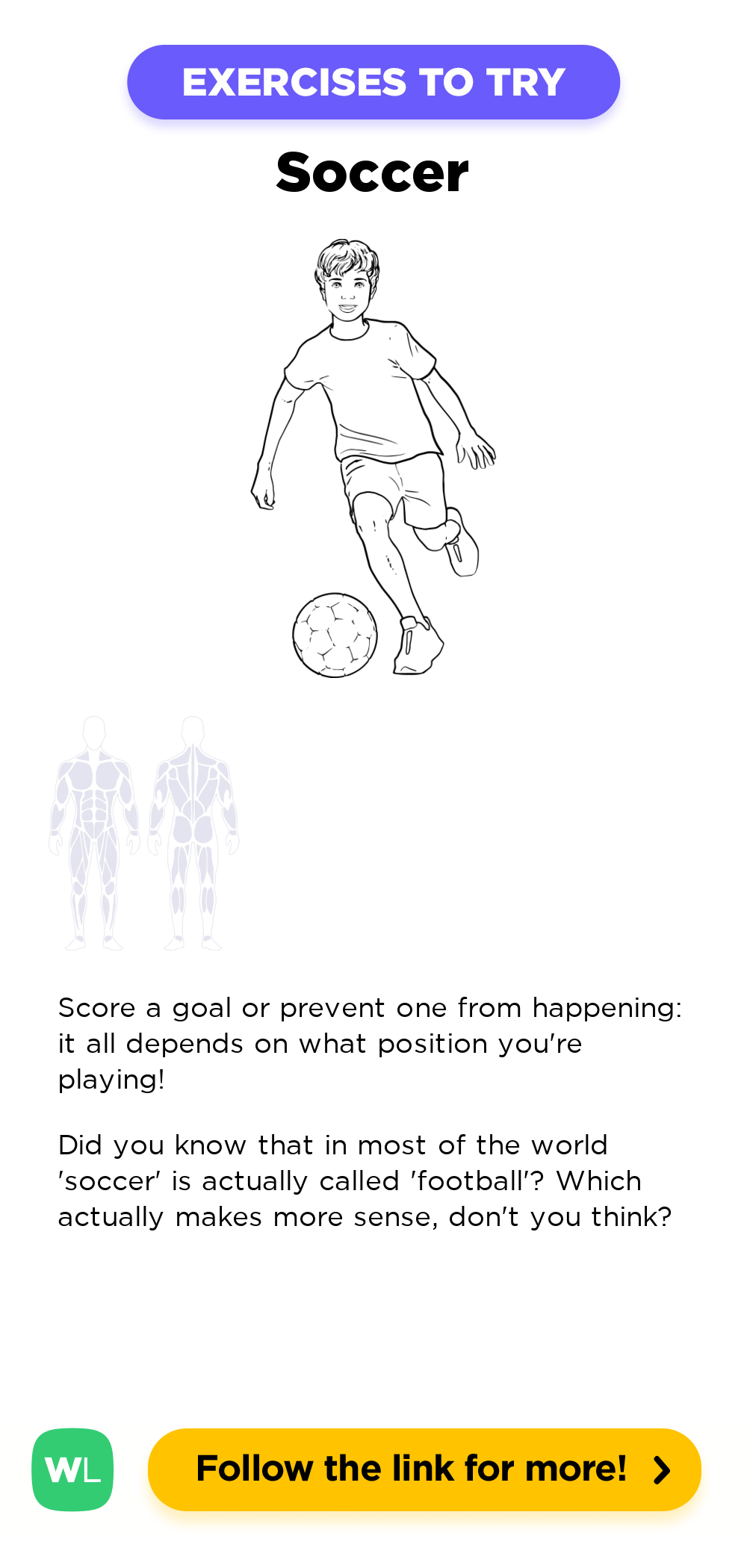 Sports - soccer / football is a gym work out exercise that targets . Refer to the illustration diagram and instructions above for how to perform this exercise correctly. are related exercise that target the same muscle groups as sports - soccer / football. Visit our free illustrated exercise directory for more exercises to try in your workouts.